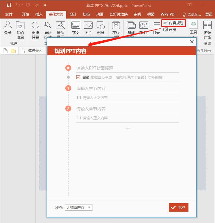 此外,它还有一个很厉害的排版功能,那就是【内容规划】了。我们点击其中的【内容规划】,将PPT的大纲填充进去,最后点击【完成】,便能快速生成一份PPT了。