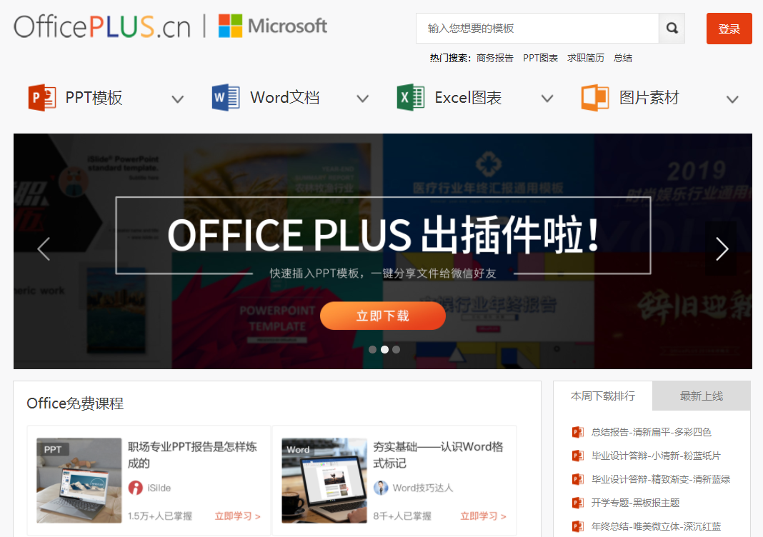 制作PPT,还需要一些精致的PPT模板来辅助。而微软官方其实有一个在线模板网站,那就是OfficePlus了,里面有大量免费的办公素材,包括PPT素材、Word素材、Excel图表以及图片素材,并且都作了详细的分类。