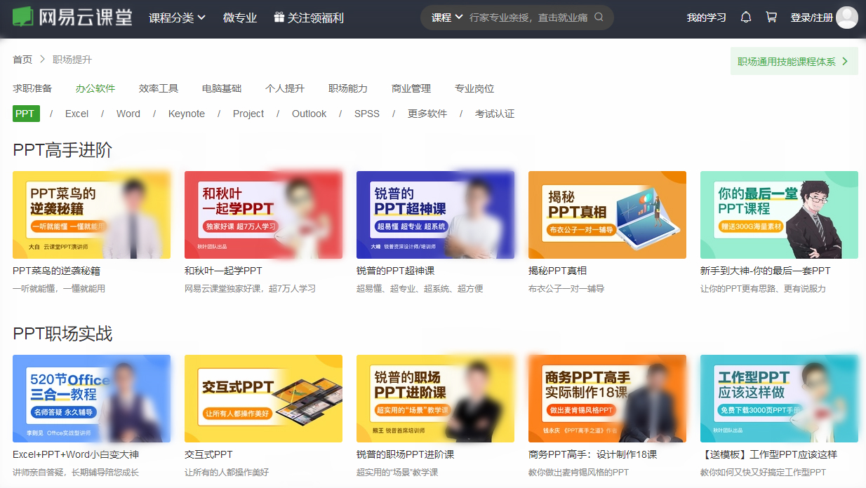 点击【课程分类】——【职场提升】——【办公软件】——PPT即可,便能看到相关的PPT课程了。当然也能直接在搜索栏中输入【PPT】,进行搜索。课程有收费的,也有免费的。