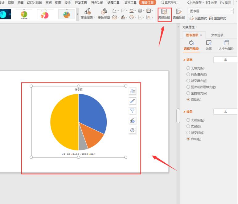 2.但有时我们的数据用半圆型饼图就可以体现了,那么这种情况下,我们该怎么办?今天,小编就教各位在PPT中,用半圆型饼图体现数据百分比的小技巧,大家一起来学习吧!首先,打开我们PPT文件;然后,切换到【插入】页面,单击【图表】控件,我们插入一个饼图;接着,切换到【图表工具】页面,单击【编辑数据】,在表格中输入数据;返回PPT,选中图表区域,单击【选择数据】功能选项,其中,数据我们选中A列和C列;选中图标中的黄色区域,设置为【无填充】、【无线条】;接着,选中图表区域,切换到【系列】页面,【第一扇区起始角度】设置为“270”