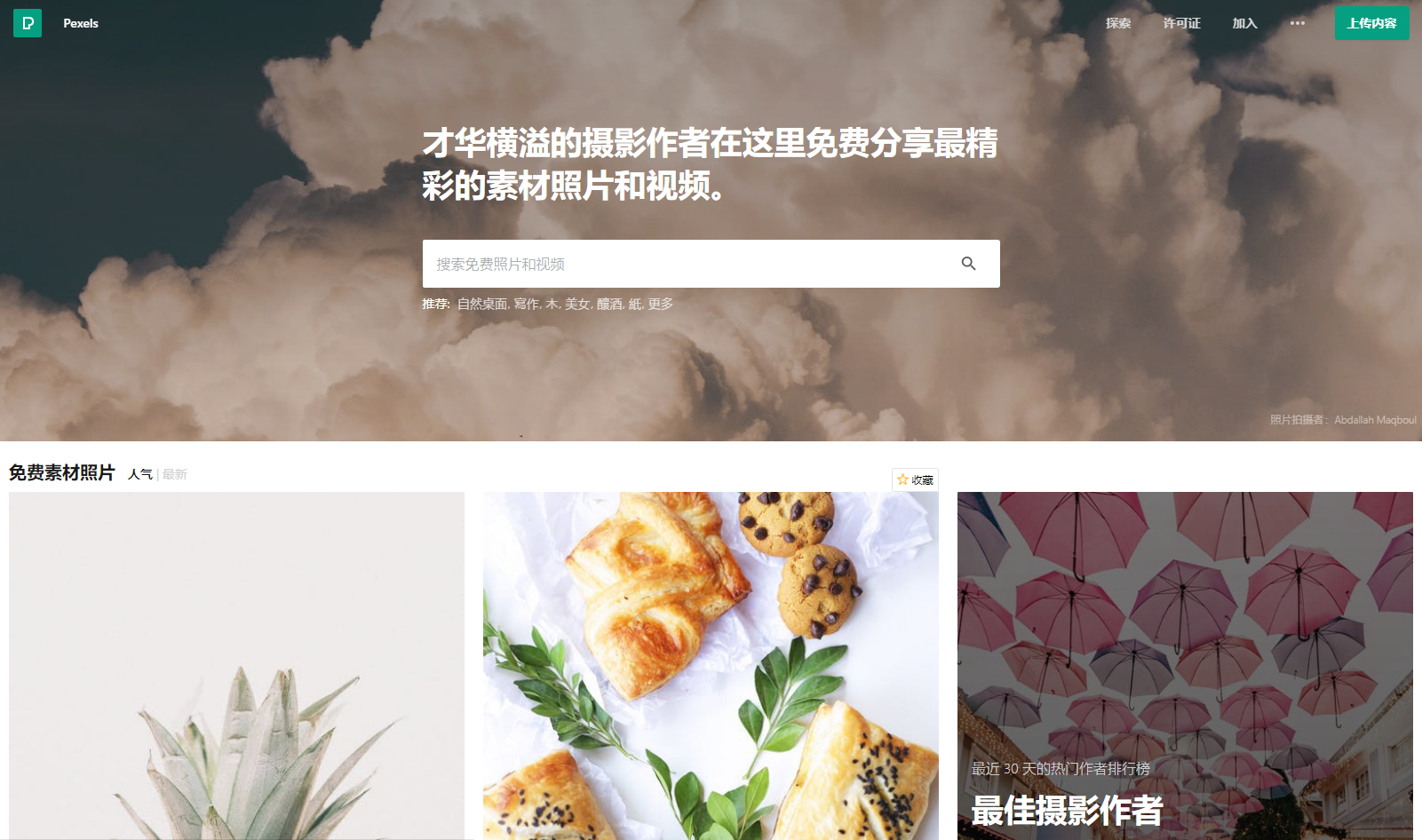 Pexels是一家国外的免费高清图片网站。适合寻找风景图和各类职场、商业场景大图。目前只支持英文搜索。