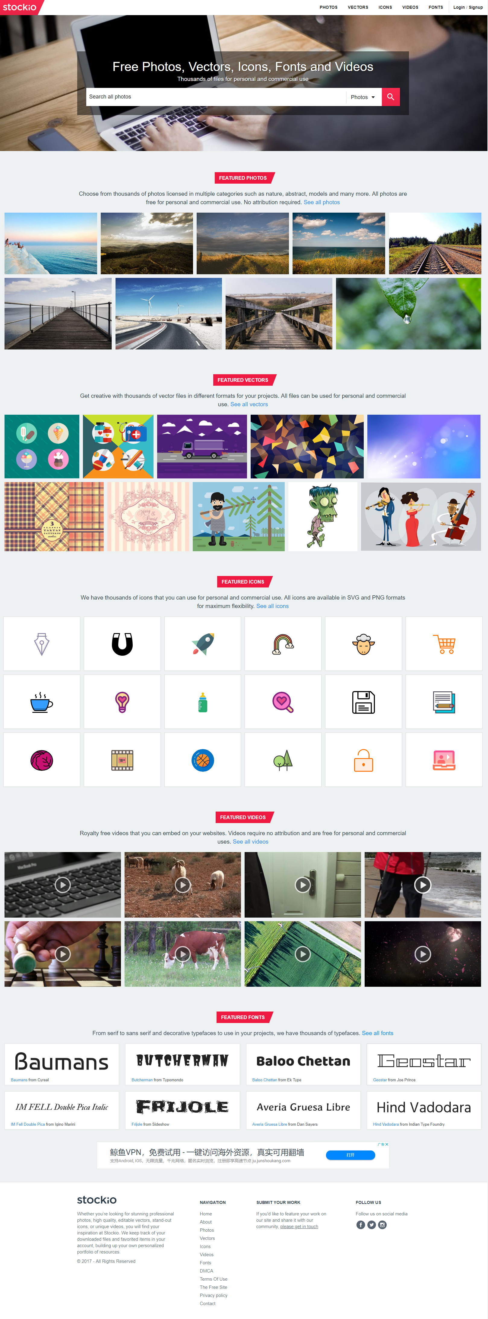 Stockio 是一个提供成千上玩的免费矢量图标、图片和视频、字体的素材资源网站,为设计师们提供丰富的设计素材并为设计灵感提供更多的参考案例,所有的素材均可用于个人或者商业用途。