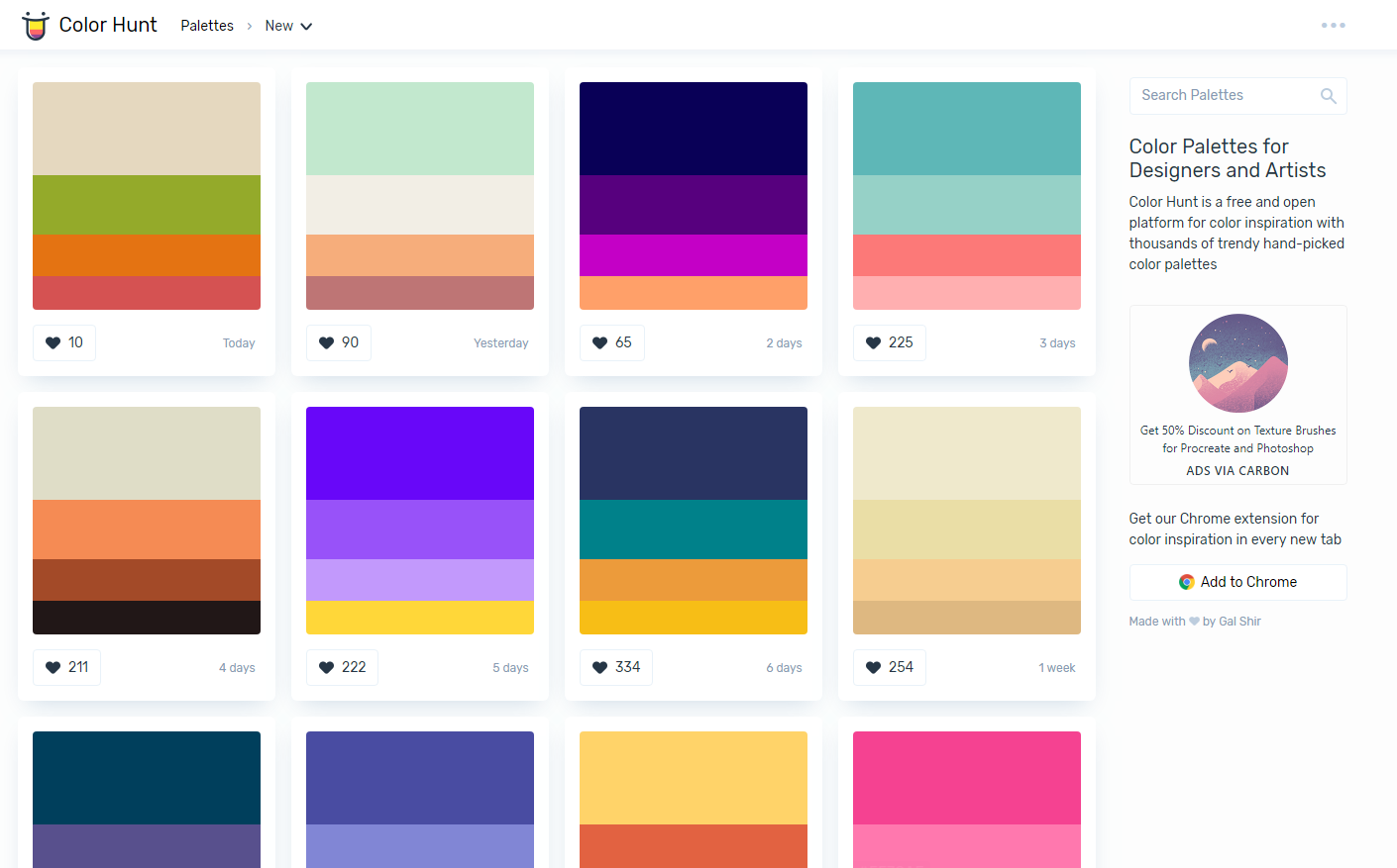 它是最简单易用的、适合绝大多数企业办公人士使用的在线现成配色工具colorhunt。colorhunt直接给出已经搭配好的配色方案,简单明了,直接使用即可。另外,它讲究少用色彩,一般都不会超过四种。