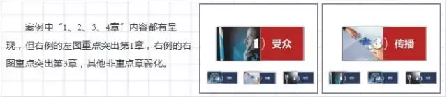 页面占比和替换转场型类似,根据不同的章进行文字颜色或背景的标注。重点用颜色突出显示,弱化非重点,也就意味着所有内容的颜色都要进行必要的调整。