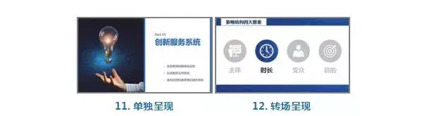 【转场呈现】指每个分目录都包含总目录中的内容,但根据章的不同,对重点和非重点做区别处理。呈现区别可以通过调整颜色和字体大小的方式,也可以用动画强调完成。