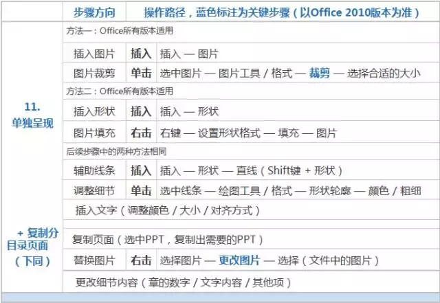 但图文型的分目录除了文字与颜色的统一外,因为不同的分类需要替换图片,所以还应注意图片的统一方式,这样PPT才能统一而规范。