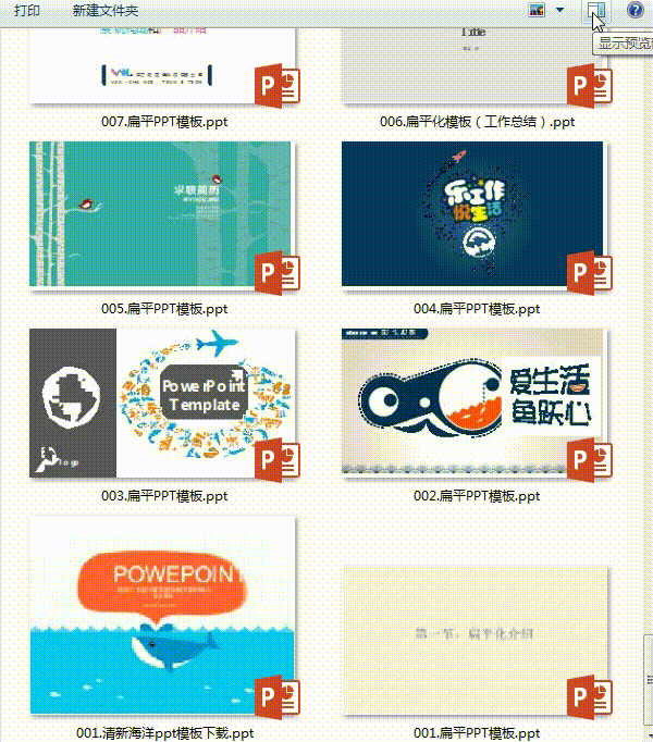 如果你还想看看PPT文件的内容,也不用打开它。打开资源管理器后,在工具栏的右侧有个“预览窗格”按钮,打开它,这时候资源管理器里会多出来预览栏,当你单击PPT文件的时候,预览栏里就会展示PPT文件的内容,现在就可以点击左键来浏览PPT文件中的页面,很方便,比一一打开看速度快多了。