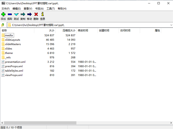然后我们再用解压软件将这个压缩包解压,然后在目录里点击【ppt】——【media】~