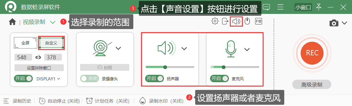 步骤3.来到软件的主界面,选择左侧的【视频录制】,进入【视频录制】页面。在此页面,您可以开启或关闭扬声器来控制录屏时声音的输入,需要录制系统声音时,可以开启扬声器;需要录制外部声音时,可以开启麦克风。为了更好地录入外部声音,可以点击页面右上角的【声音设置】对麦克风进行降噪、增强处理。接着您可以点击页面左侧【自定义】选择PPT录制范围,然后点击【REC】按钮进行录制。