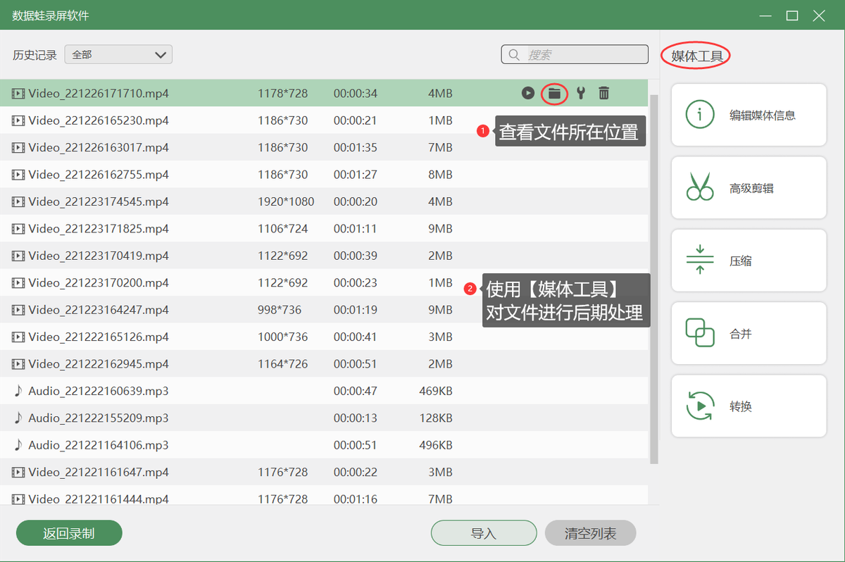 步骤5.点击【完成】按钮,进入【录制历史】页面,在此页面您可以查看历史的录屏文件,还可以使用【媒体工具】对文件进行压缩、合并、转换等后期处理。