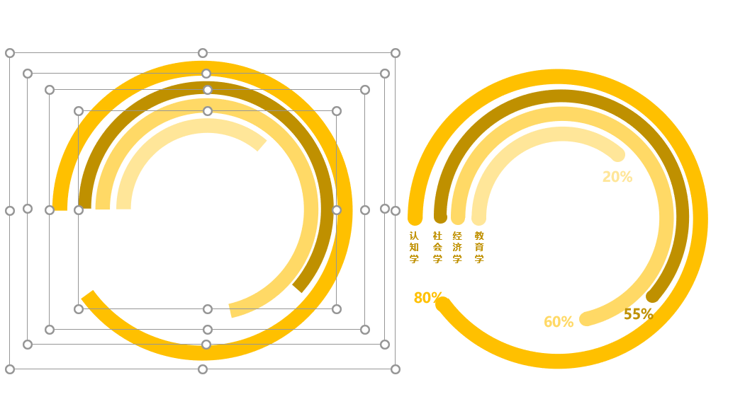 (3)依次复制多个空心弧,并设置长度和半径,对齐即可完成环形柱状图。