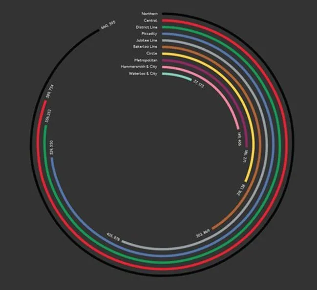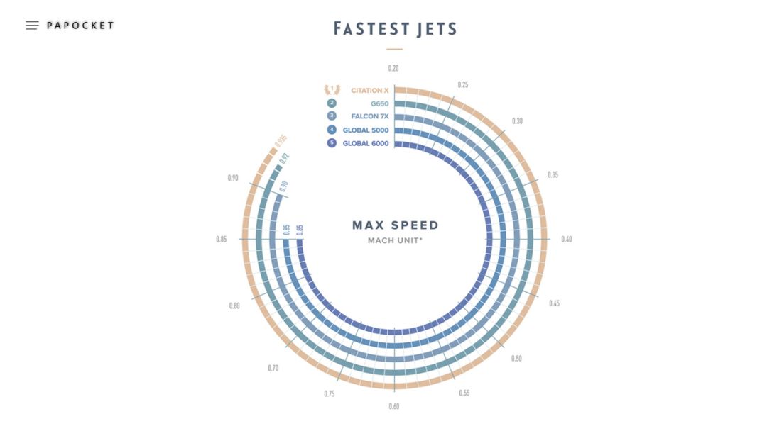 环形柱状图是通过柱子的长度,角度即数据,即圆弧周长来体现数据差异。相比其他的上期的玫瑰图,柱状图的柱子是没有任何的外形改变,所以在视觉上不会有夸大的效果,但能容纳更多的分类数据。