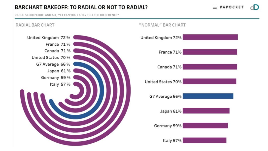 不过我们的视觉系统比较善于理解直线,因此笛卡尔条形图是比较数值的更好选择,但是数据细节不够,美观美化是这类图表的第一诉求,在一些需要数据展示美化要求较高、且单系列的内容呈现中比较常见。