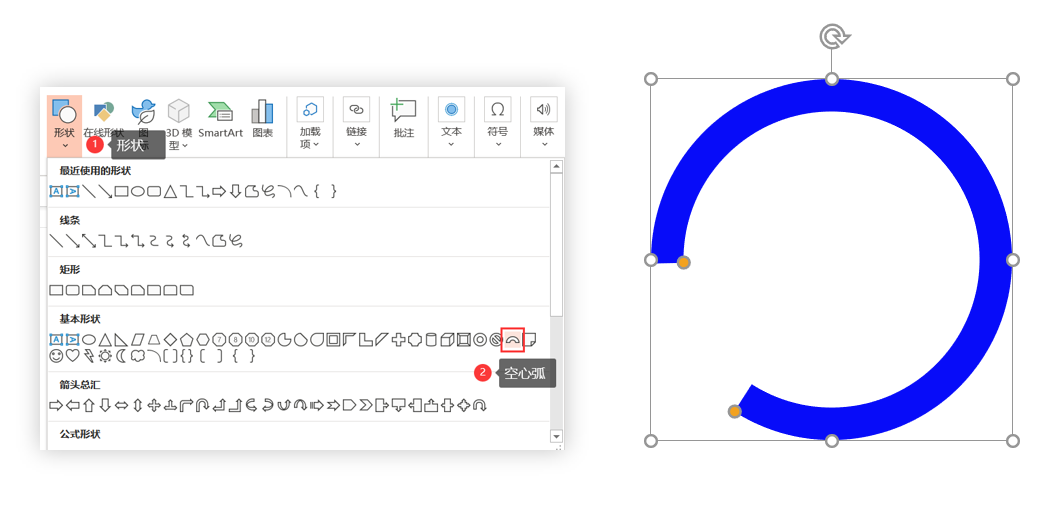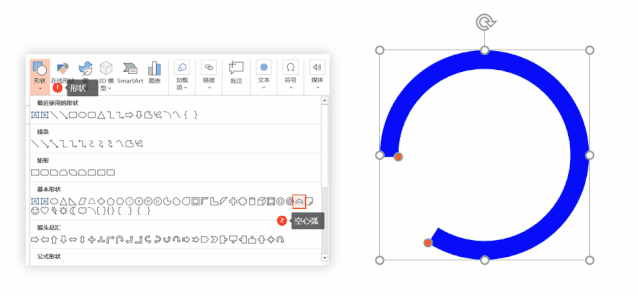 (1)插入“形状-空心弧”。