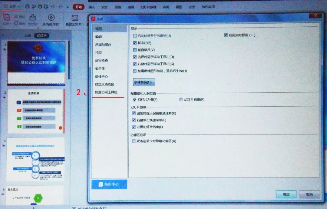 PPT工具栏有众多工具,但是其实只有几个比较主要的是经常使用的。添加到常用工具栏可以帮助我们快速找到,避免大海捞针浪费宝贵的时间。操作办法:文件——选项——快速访问工具栏,可以将左边工具栏里面常用的工具添加到右边。