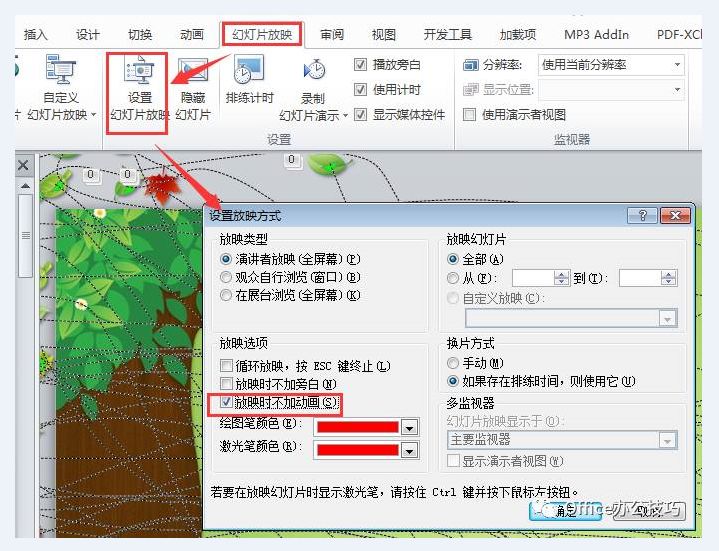 制作了动画之后,在有些情况下需要无动画播放,此时,你只需要选择幻灯片放映——设置幻灯片放映——放映时不加动画。
