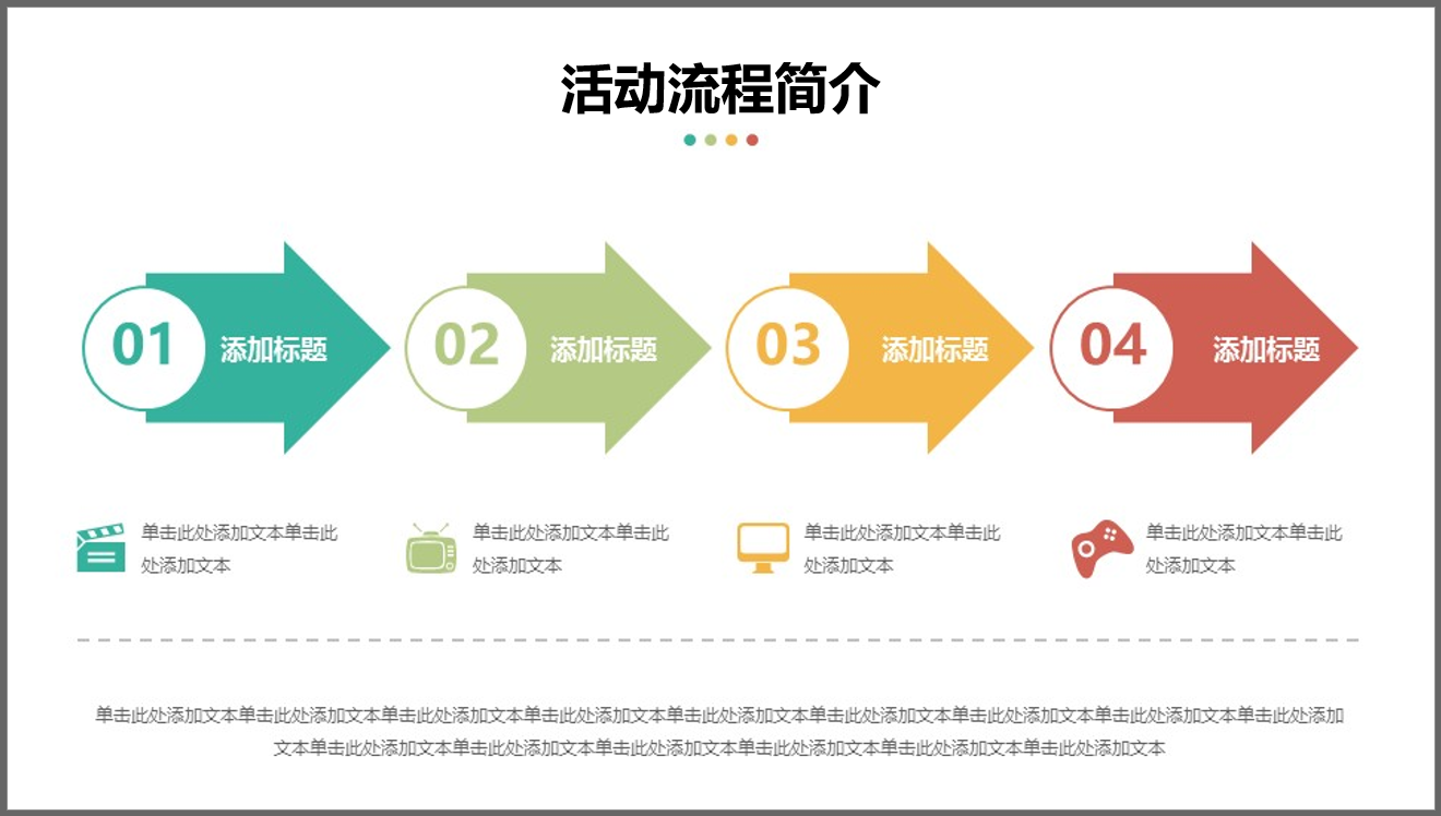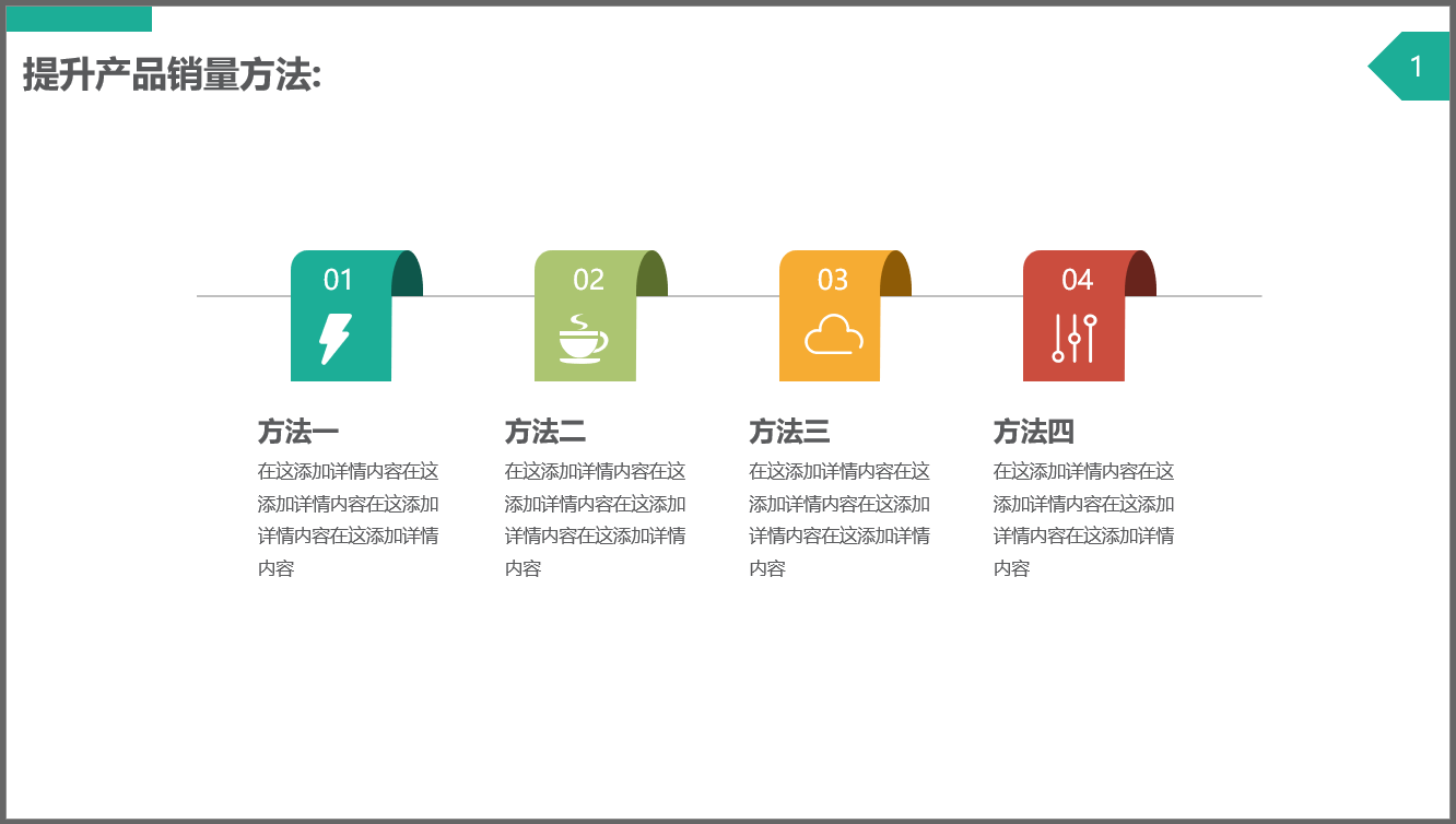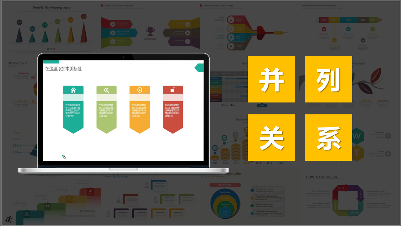 并列是单页PPT内容最常用的一种逻辑关系,表示单页PPT内容各部分是平等关系,可以互换位置。例如:介绍"方法一、方法二、方法三、方法四"就是并列关系。
