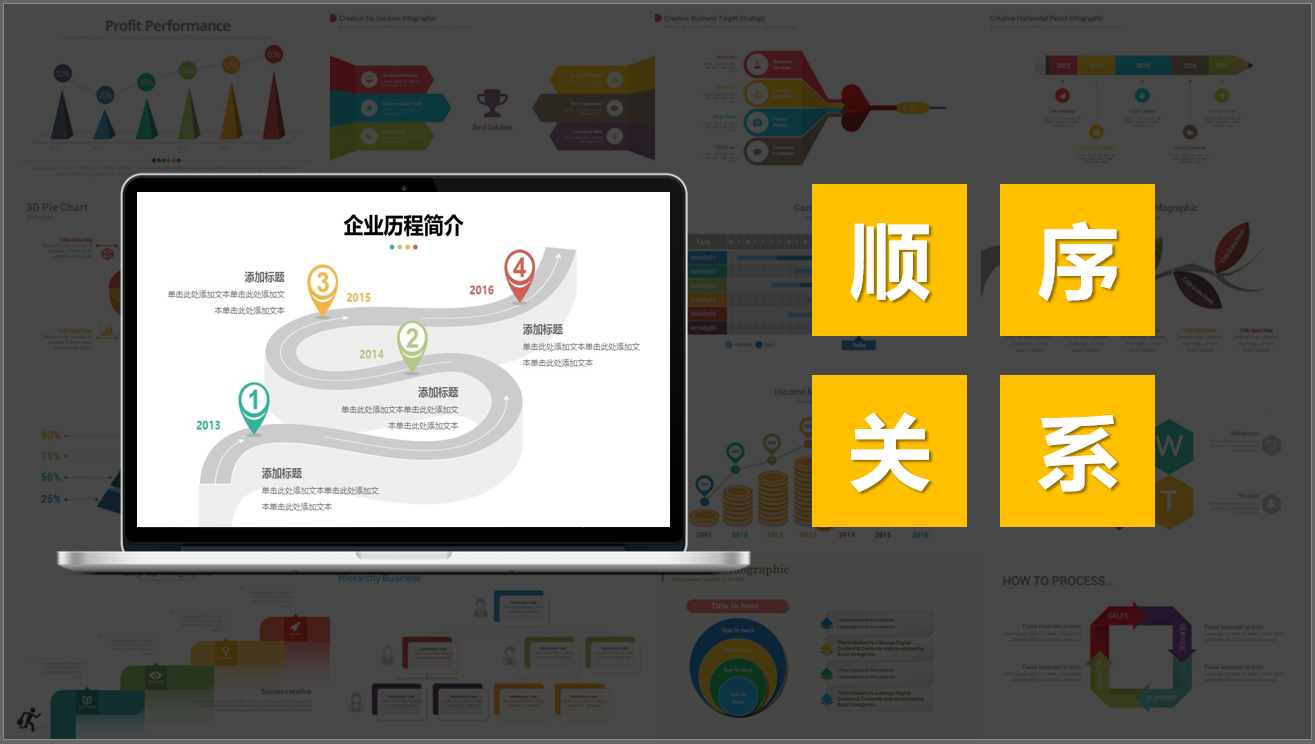 表示单页PPT内容各部分按照时间历程、流程、步骤、重要性排序等等,顺序与并列的最大区别在于有先后之分。比如按照流程顺序排列、按照时间顺序排列等。