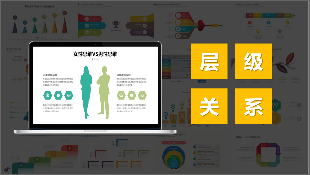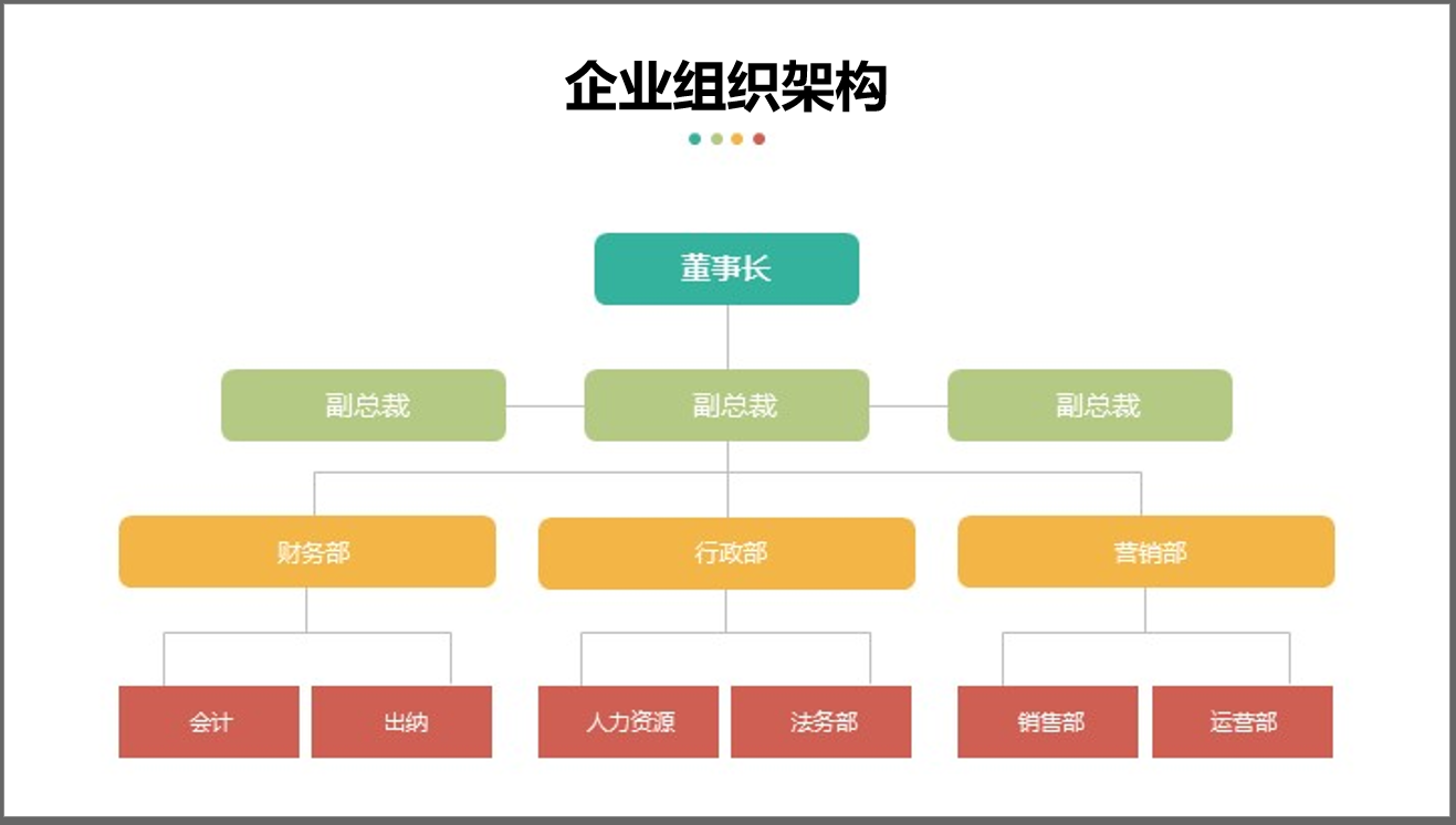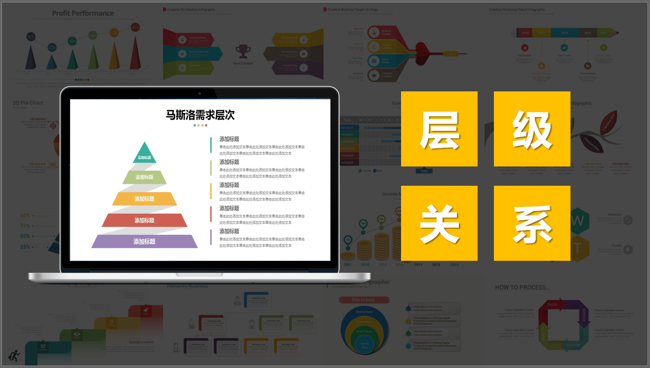 层级关系表示PPT页面的各部分内容在纵向上按照等级划分为不同的上下节制的层级组织结构。比如企业职员架构、马斯洛需求层次等等。