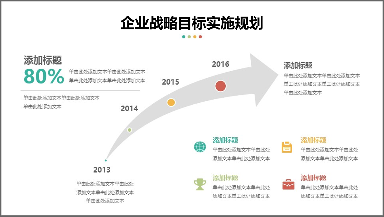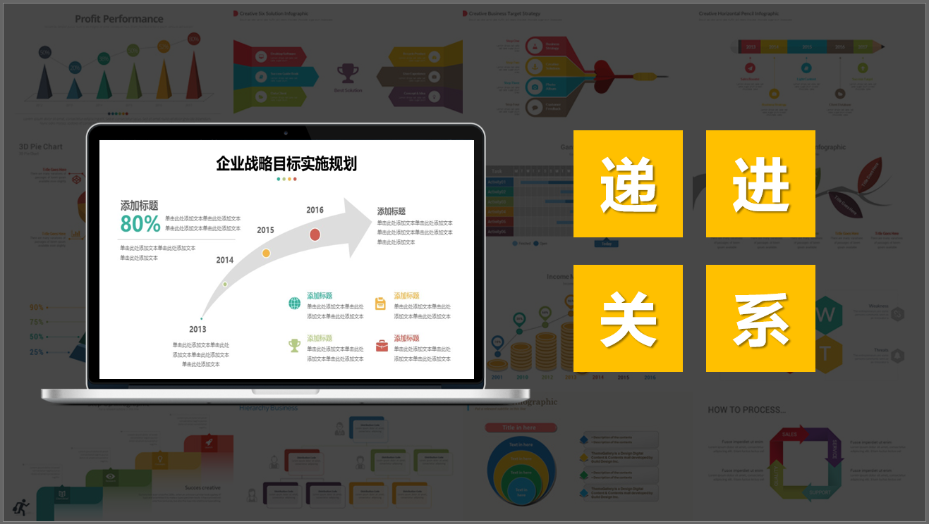 递进关系表示PPT内容的后面部分内容相对于前面的内容基础上更进了一层。比如用PPT呈现企业战略目标的逐年升级等。