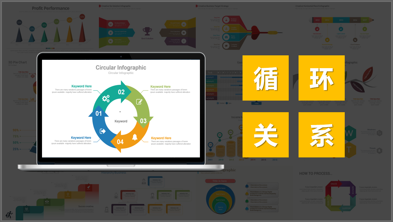 循环关系表示PPT各部分内容经过一系列的发展或变化又回到初始状态,或者事物发展形成完整闭合圈。比如表示四季的交替变化,企业的产品生产、销售、回收的产业链等等。