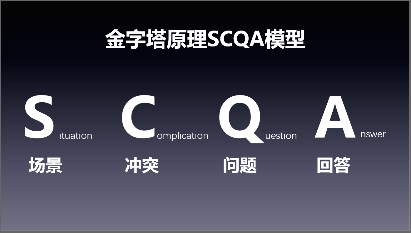 场景(Situation)——冲突(Complication)——问题(Question)——回答(Answer),这个模型在演讲和写作中经常会用到。