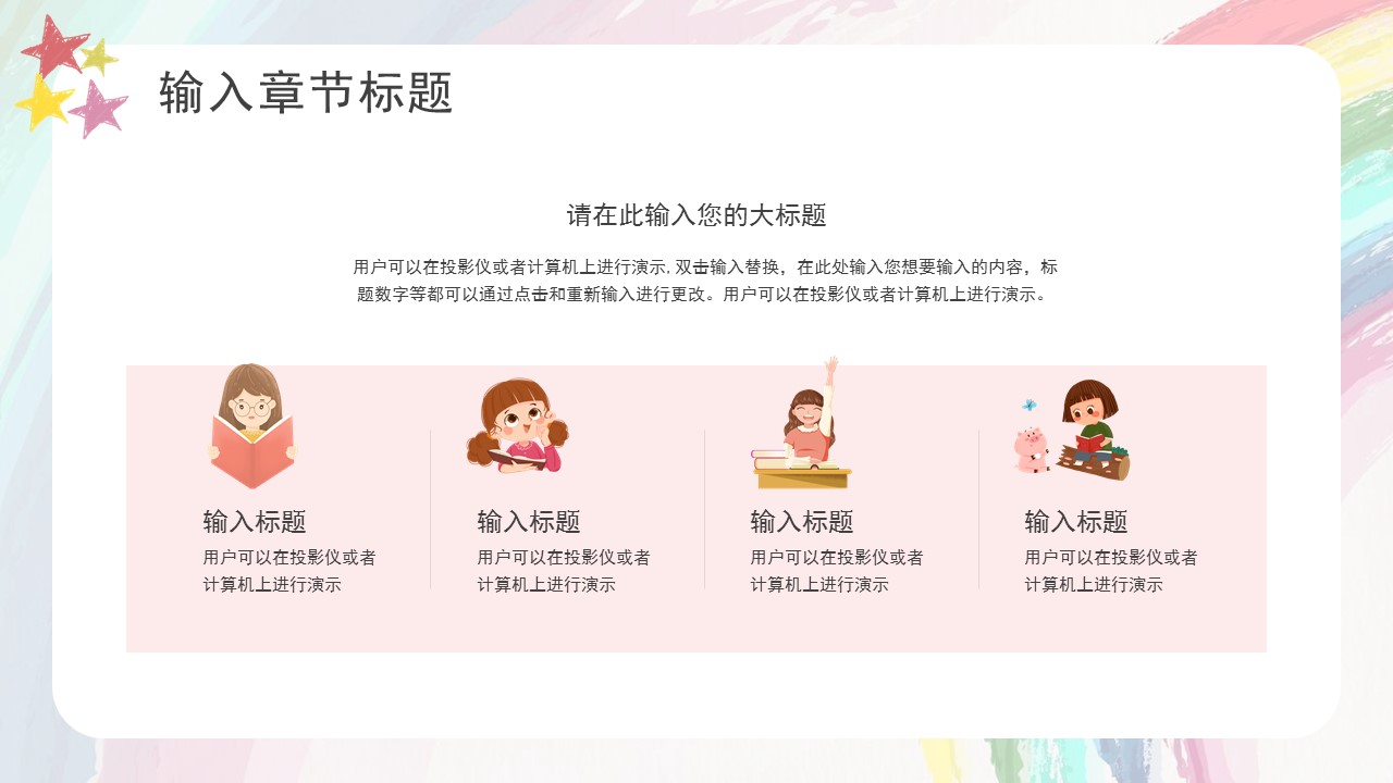 1.适用于幼儿园 学校 学校 中小学生 少儿 儿童 幼儿 教师 老师 幼师 微课 信息化 语文 教育机构 教学 设计 计划 教学方案 培训机构 培训计划 课堂 公开说课 优质课 课堂 示范课 多媒体课件 试讲 多媒体 成长档案 记录篇 主题班会 案例 赛课 大赛 比赛 家长会 教育通用模板老师们的福利来啦,这款模板非常适合儿童小学生教育教学使用哦,下面让我们一起来欣赏欣赏吧,希望得到你的喜欢呢[谢谢]点击下方蓝字获取模板PPT办公