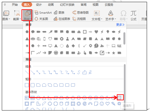 首先,新建一个PPT演示文稿,在插入菜单下选择形状工具,在下拉菜单中选择类似于风车叶的图形,如图1