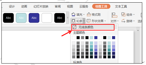 用鼠标拖动的方法调整顶点,使其形状接近风车叶形状,在绘图工具下选择轮廓按钮,在下拉菜单中选择无线条颜色,如图3