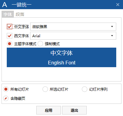 操作姿势:打开PPT,在NT插件菜单栏下(左上角),单击“一键统一”,在弹出对话框进行设置。