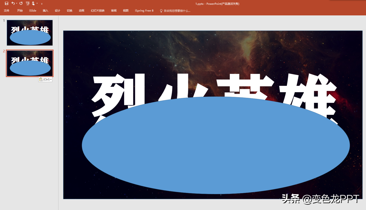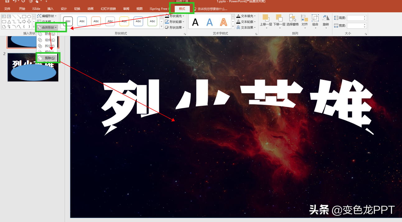 3.三、然后复制粘贴一张新的幻灯片四、选择第一张幻灯片,按住ctrl全选文字和椭圆,在格式中找到合并形状,选择剪除,然后字体下半部分就被掏空了