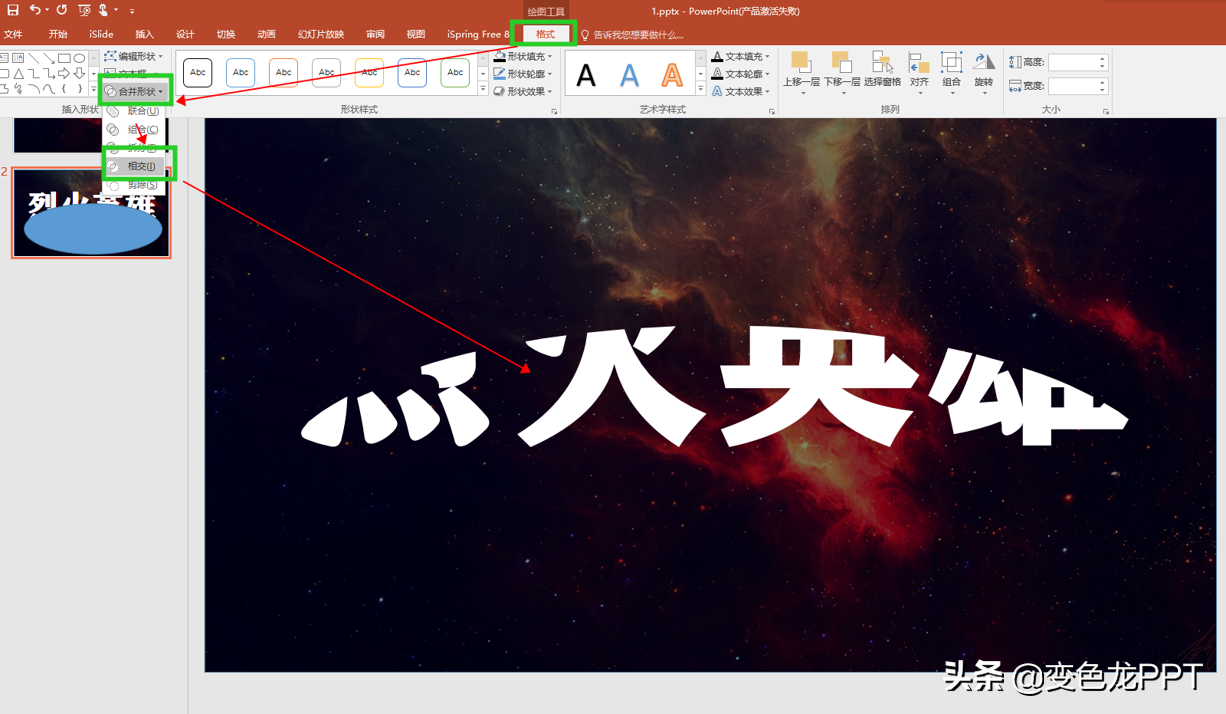 4.五、选择第二张幻灯片,按住ctrl全选文字和椭圆,在格式中找到合并形状,选择相交,文字的上半部分就消失了