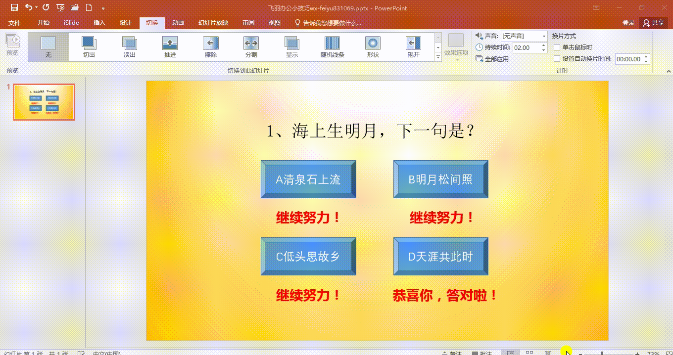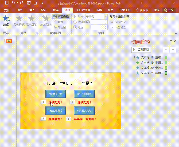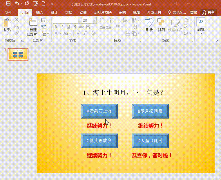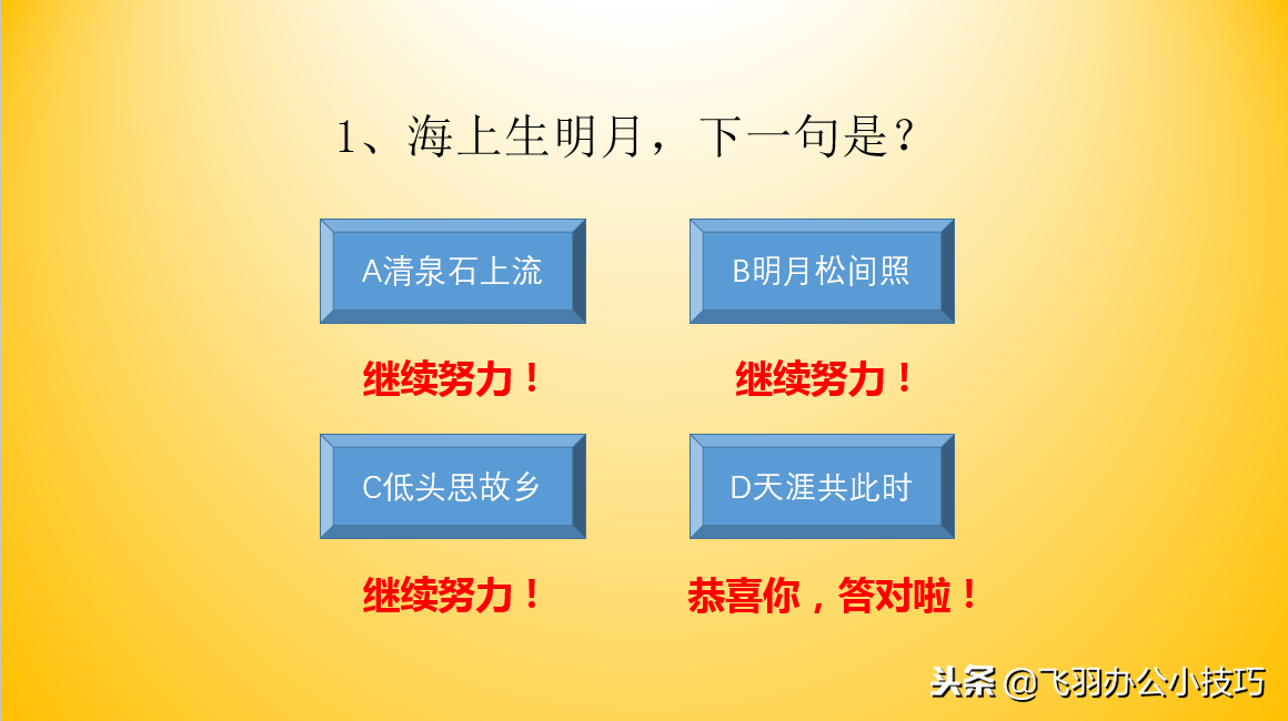 3、插入文本框,输入文字:恭喜你答对了!复制文本框,粘贴三份,修改文字为:继续努力哦!把文本框移动到对应的选项棱台下面。
