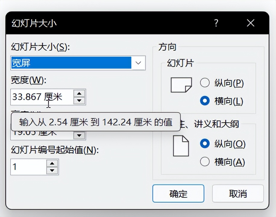 4.注意,幻灯片的宽和高的值范围是有限制的,宽高范围为:2.54cm到142.24cm。