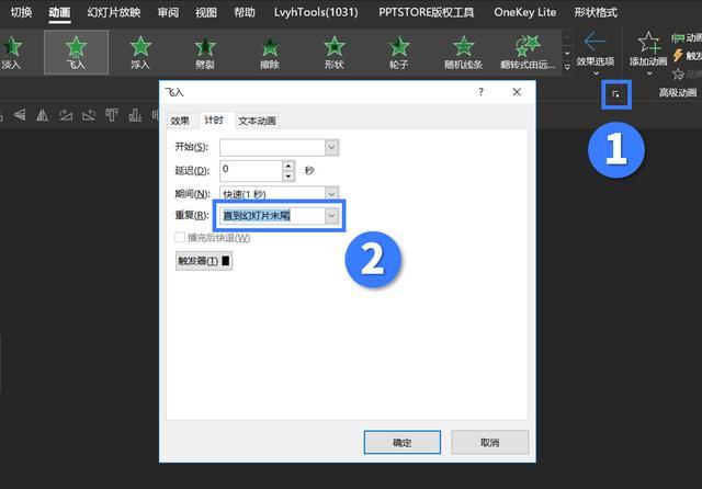还是在效果项目那里,点击效果项目扩展菜单-计时栏目中的重复(R)-直到幻灯片末尾。这个时候你的弹幕就会不对重复飞入幻灯片中。