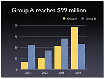 演示的对象是观众。但用一条又一条的要点令观众生厌可没有好处。应用文本也要遵循这一原则。最优秀的幻灯片可能根本没有文本。由于今天人们过于依赖文本型幻灯片,这听起来可能有些荒唐,但如果没有演示者的解说,再优秀的PowerPoint幻灯片也几乎没有什么意义。记住,幻灯片的目的在于支持解说者的叙述,而不是使解说者成为多余的人。