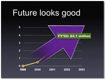 曲线图:用于说明趋势。例如,上面这幅简单的曲线图说明我们的销售在逐年增长。增长趋势良好。最后的箭头强调一个问题:我们将来的发展似乎不错。