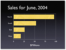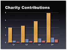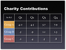 但是,表格可能缺乏视觉效果。例如,如果您希望说明您们做出的贡献显著高于其它两个部门,最好以条线图(见下图)的形式进行说明。但如果您希望弱化您们的贡献低于其它部门这一事实,用表格传达信息就可减少人们的注意力或感情色彩。