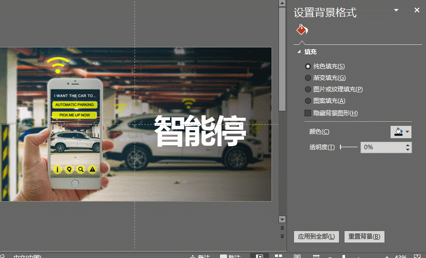 将“智能停车系统”拆成单字,然后选中文本,使用文本的渐变填充,将渐变光圈的一端设置为100%透明度,可以形成渐变的效果。