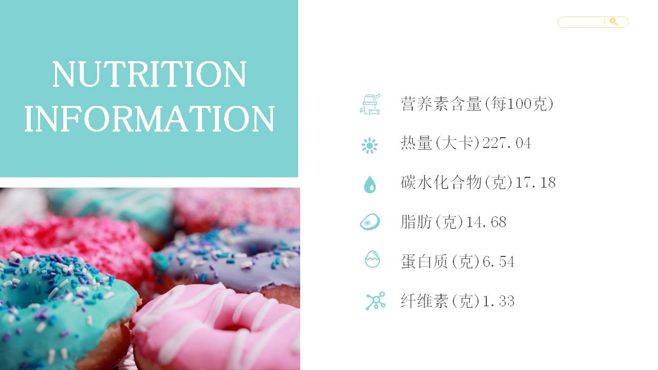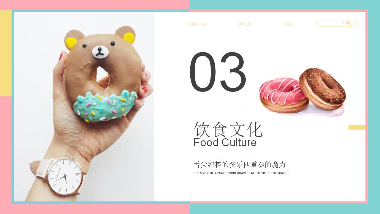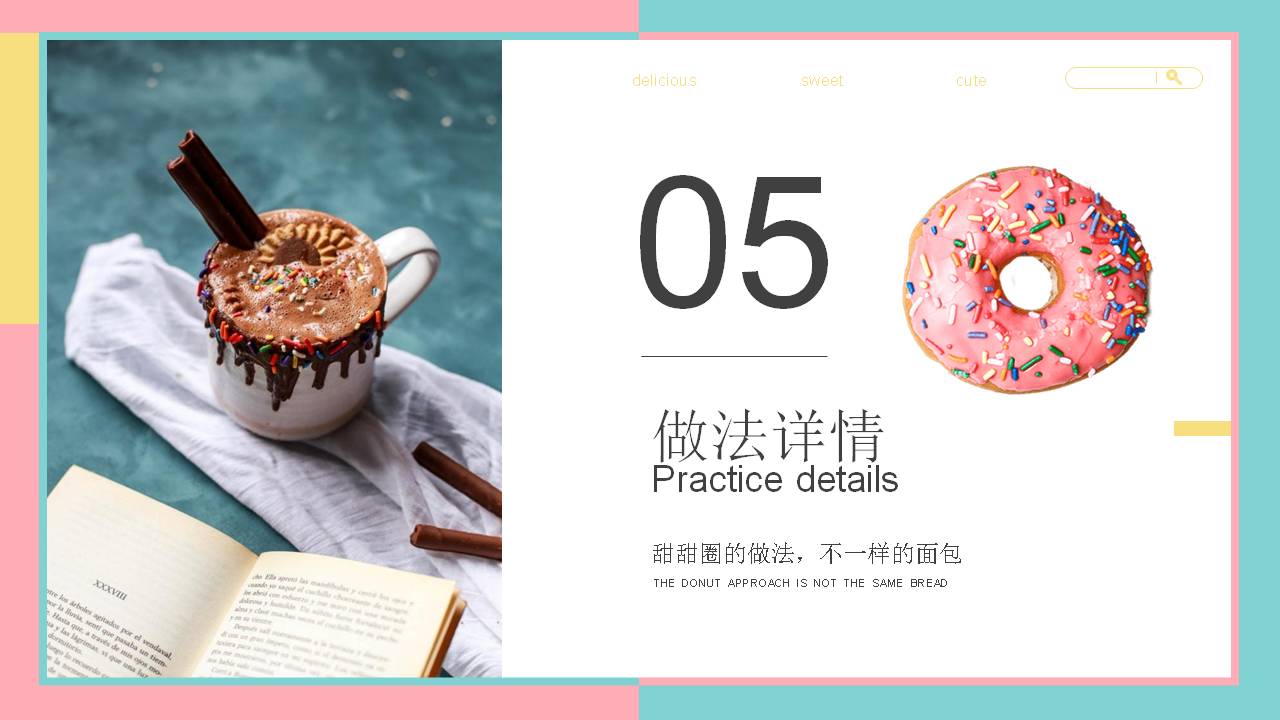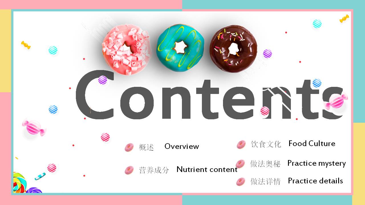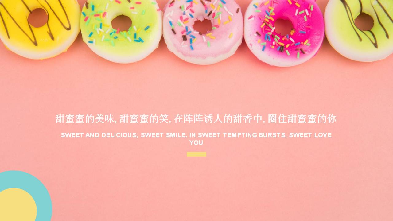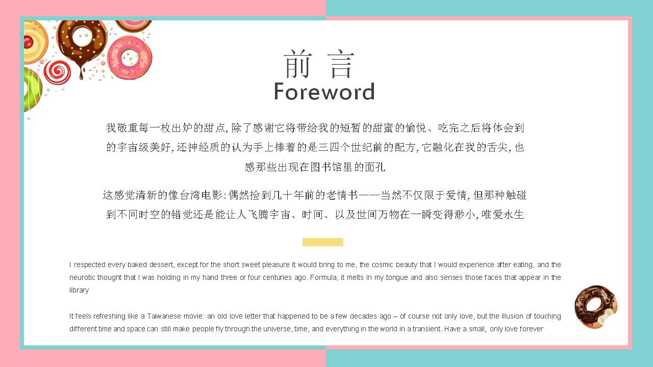 6.甜甜圈PPT内容简介:美食甜点篇——甜甜圈用舌尖的味蕾来感受甜蜜和幸福我敬重每一枚出炉的甜点,除了感谢它将带给我的短暂的甜蜜的愉悦、吃完之后将体会到的宇宙级美好,还神经质的认为手上捧着的是三四个世纪前的配方,它融化在我的舌尖,也感那些出现在图书馆里的面孔。