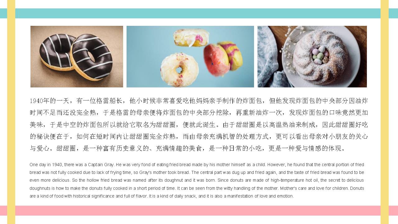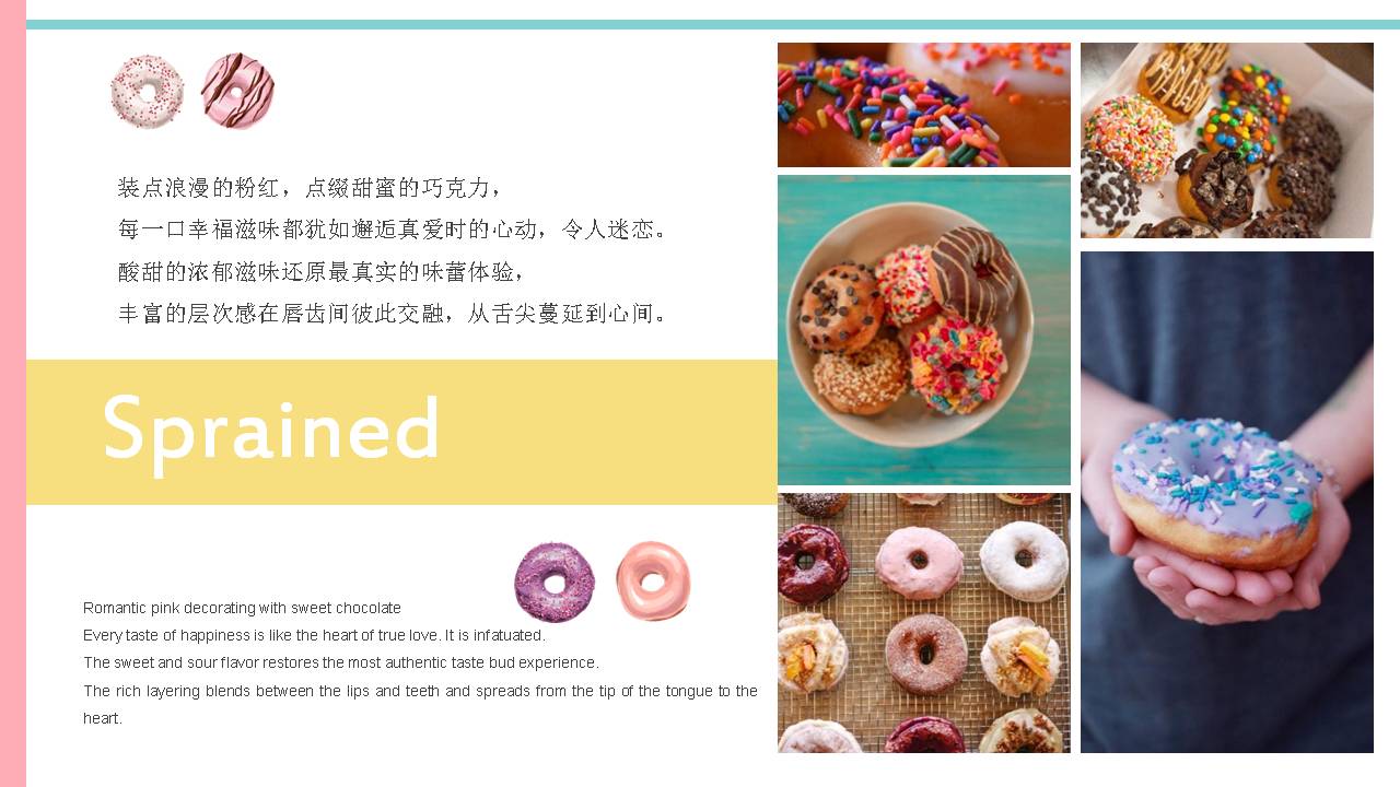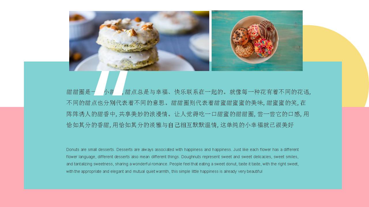 5.PowerPoint模板内容页,使用了多张甜点图片、糕点图片、甜甜圈图片等,于甜甜圈介绍文案排版。