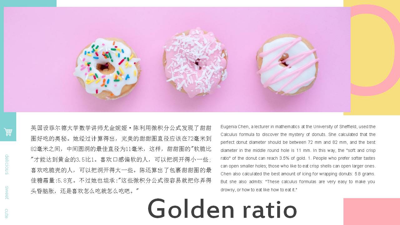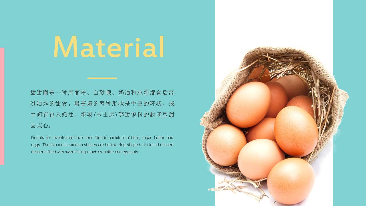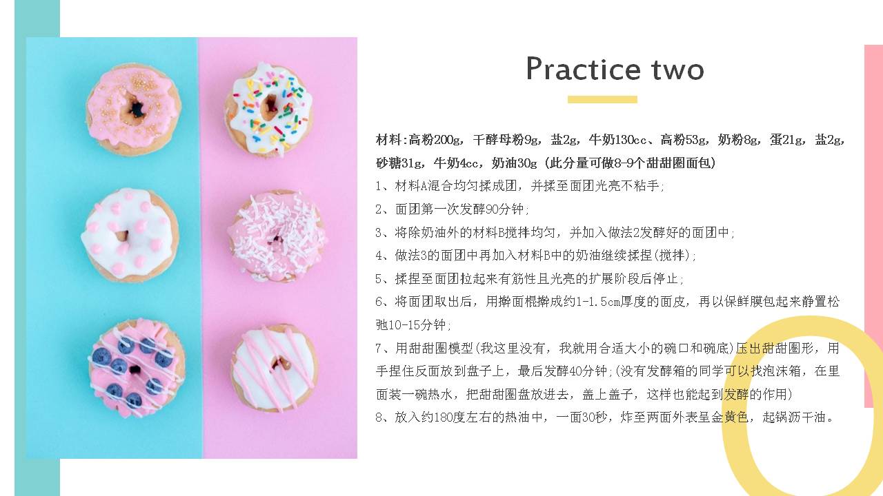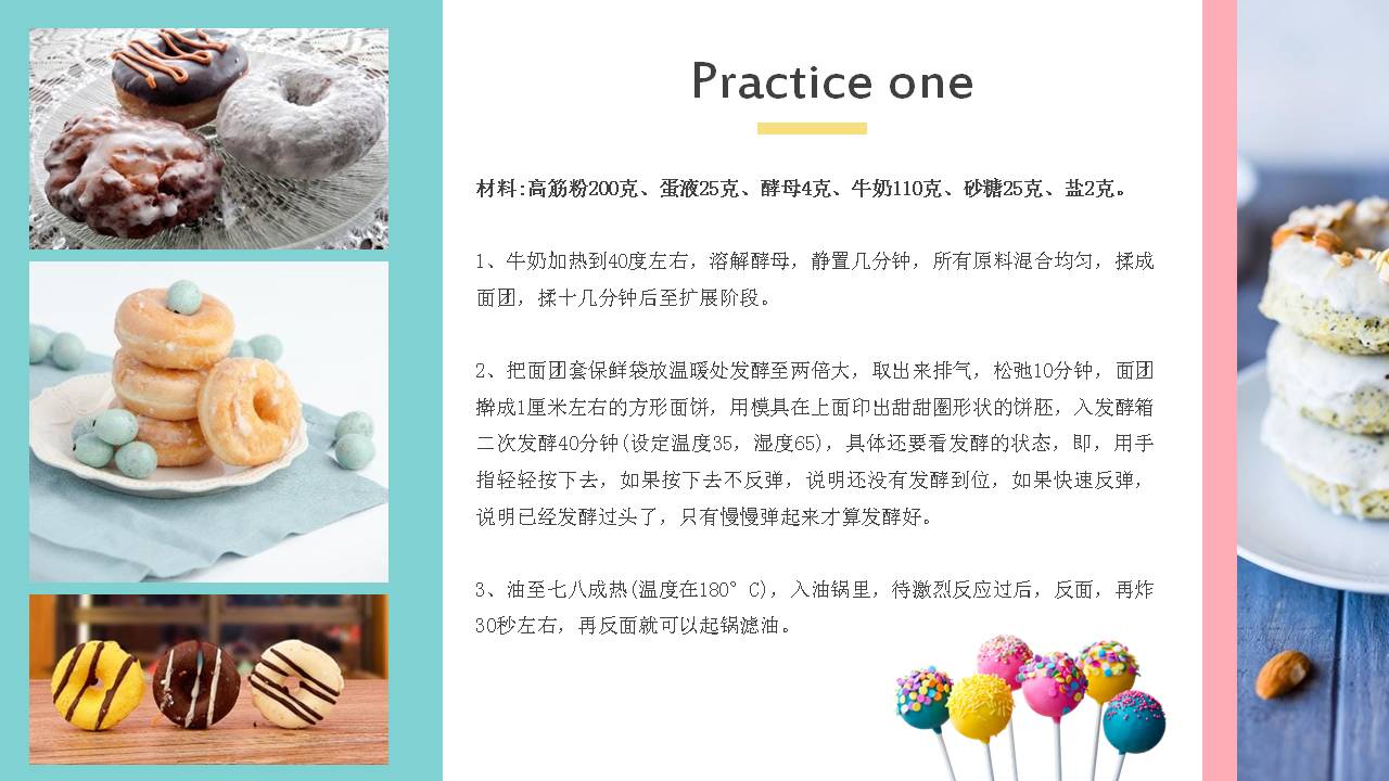 5.PowerPoint模板内容页,使用了多张甜点图片、糕点图片、甜甜圈图片等,于甜甜圈介绍文案排版。