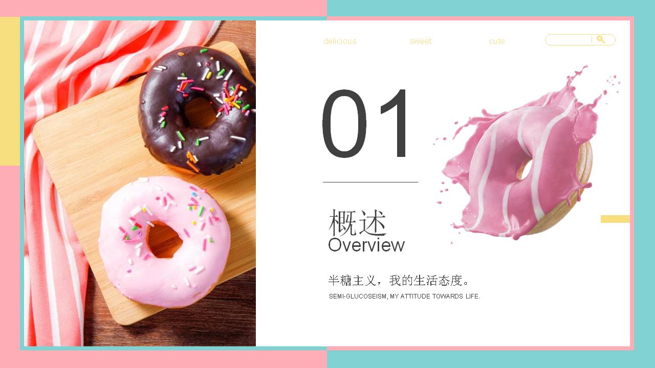 1.这是一套精美马卡龙配色的,美食甜甜圈PPT模板,共24张;PPT模板使用了马卡龙配色设计。