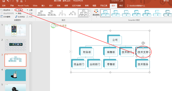 同样我们还可以对这个分支的内容进行升级和降级处理,例如现在我们需要对技术支持部门进行升级,我们选中技术支持,然后点击升级即可,如下图所示: