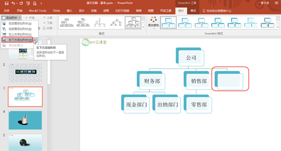 如果我们现在有个技术部门需要添加到销售部旁边怎么办呢?此时我们可以点击选择公司,然后在“设计”→“添加形状”下拉菜单选择“下方添加形状”,此时会在下方弹出一个对话框,如下图所示: