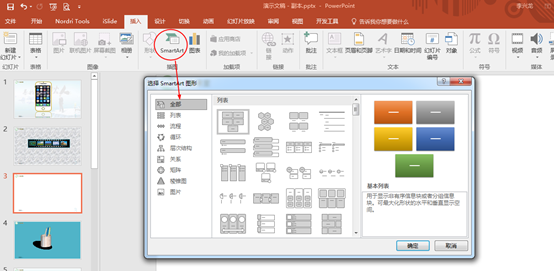 那SmartArt这个功能在PPT哪里呢?点击“插入”→“SmartArt”就会弹出一个对话框,里面有很多的流程图,我们可以根据自己的需求插入相关的流程图: