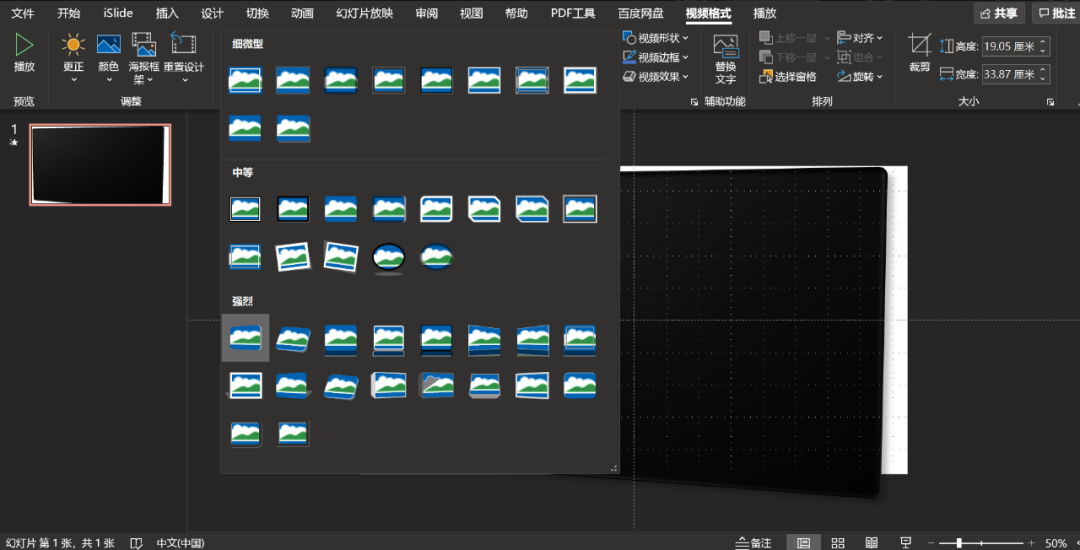 选中已插入PPT的视频-【视频格式】-【视频样式】设置自己喜欢的视频样式,以本文为例即为:其他-强烈-棱台左透视,然后适当缩小视频并移动到适宜的位置。