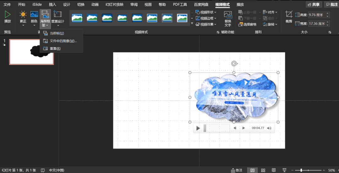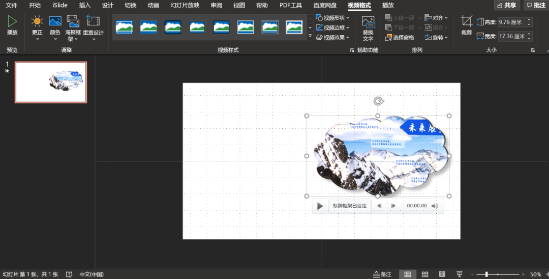选中视频-【视频格式】-【视频样式】-【视频形状】设置自己喜欢的任意形状,以本文为例即为:【视频形状】-基本形状-云形。