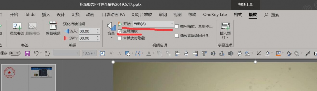 点击幻灯片中的视频,在开始中选择自动播放,全屏播放,点击切换,选择自动切换。用同样的方式设置其他幻灯片。