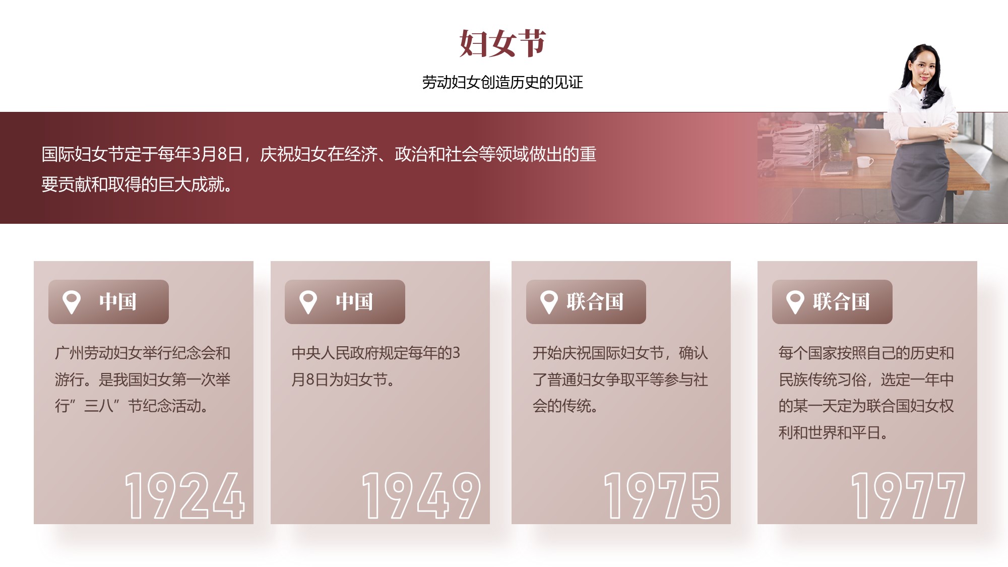 对于标题+总结+多段分支内容的结构,使用这样的排版是最不容易出错的。为了体现女性地位的提升,这页还增加了一个职场成功女性形象的图片。